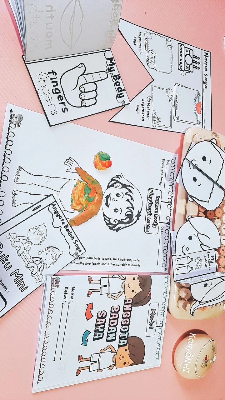 Selain modul latihan bertema, ada buku mini Anggota Badan Saya dan My Body Mini Book jika nak guna. Tuan puan boleh print dan gunting 4 bahagian untuk jadikan mini book.