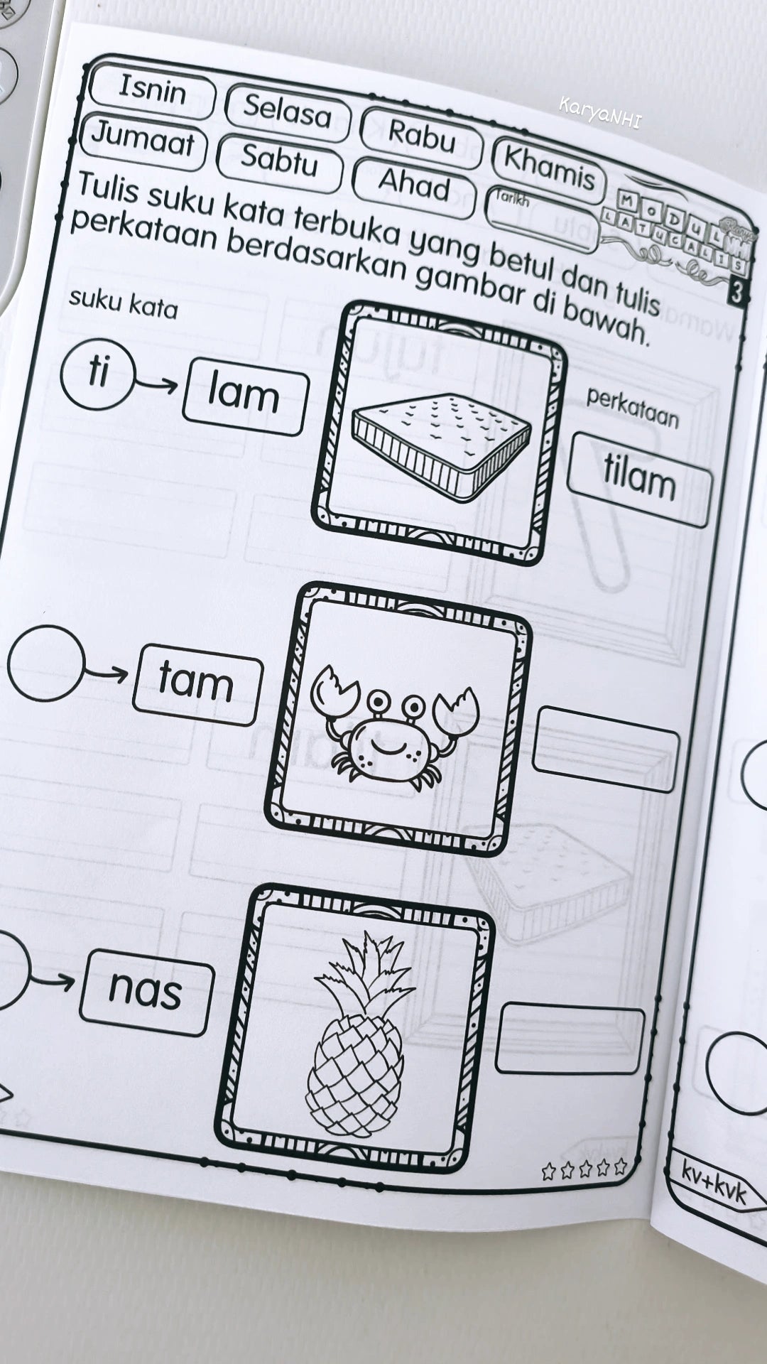 ✔️ Modul LaTuCaLis 3 : Fokus pada kemahiran membaca dan menulis perkataan kv+kvk, kvk+kv dan kvk+kvk.